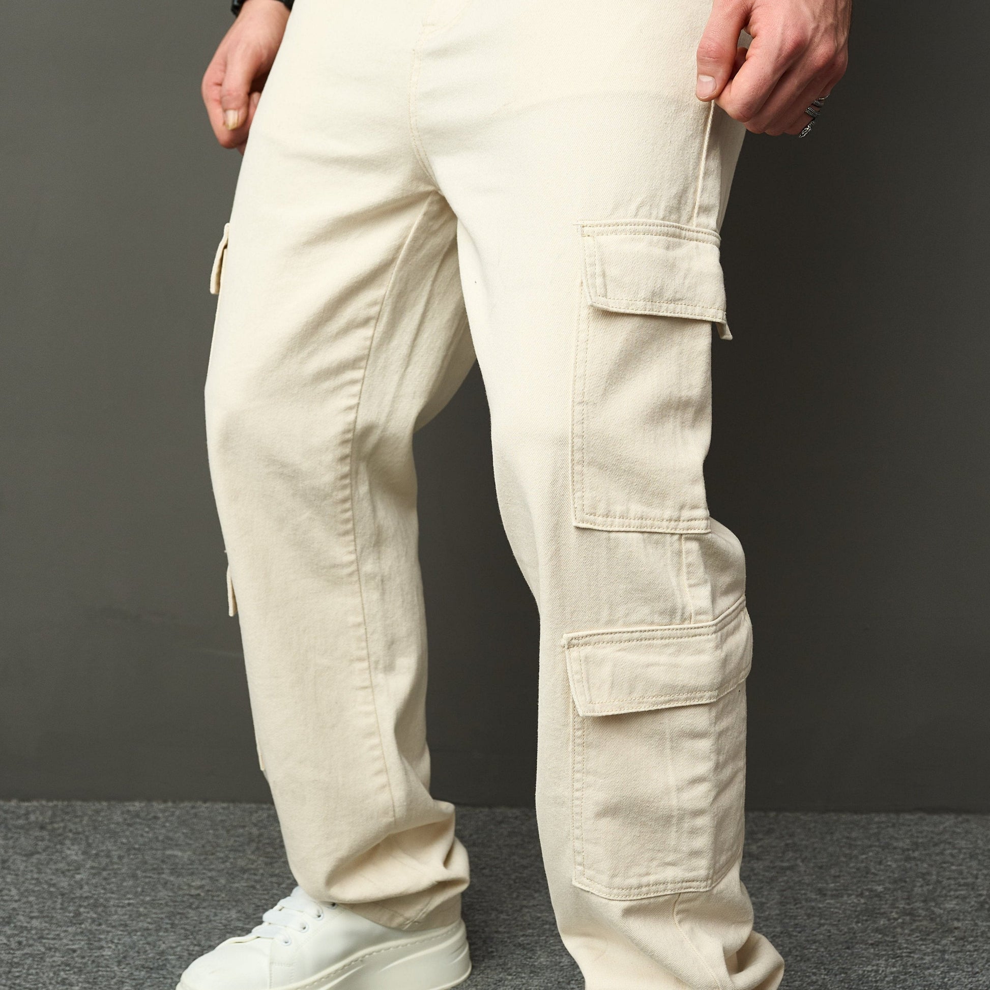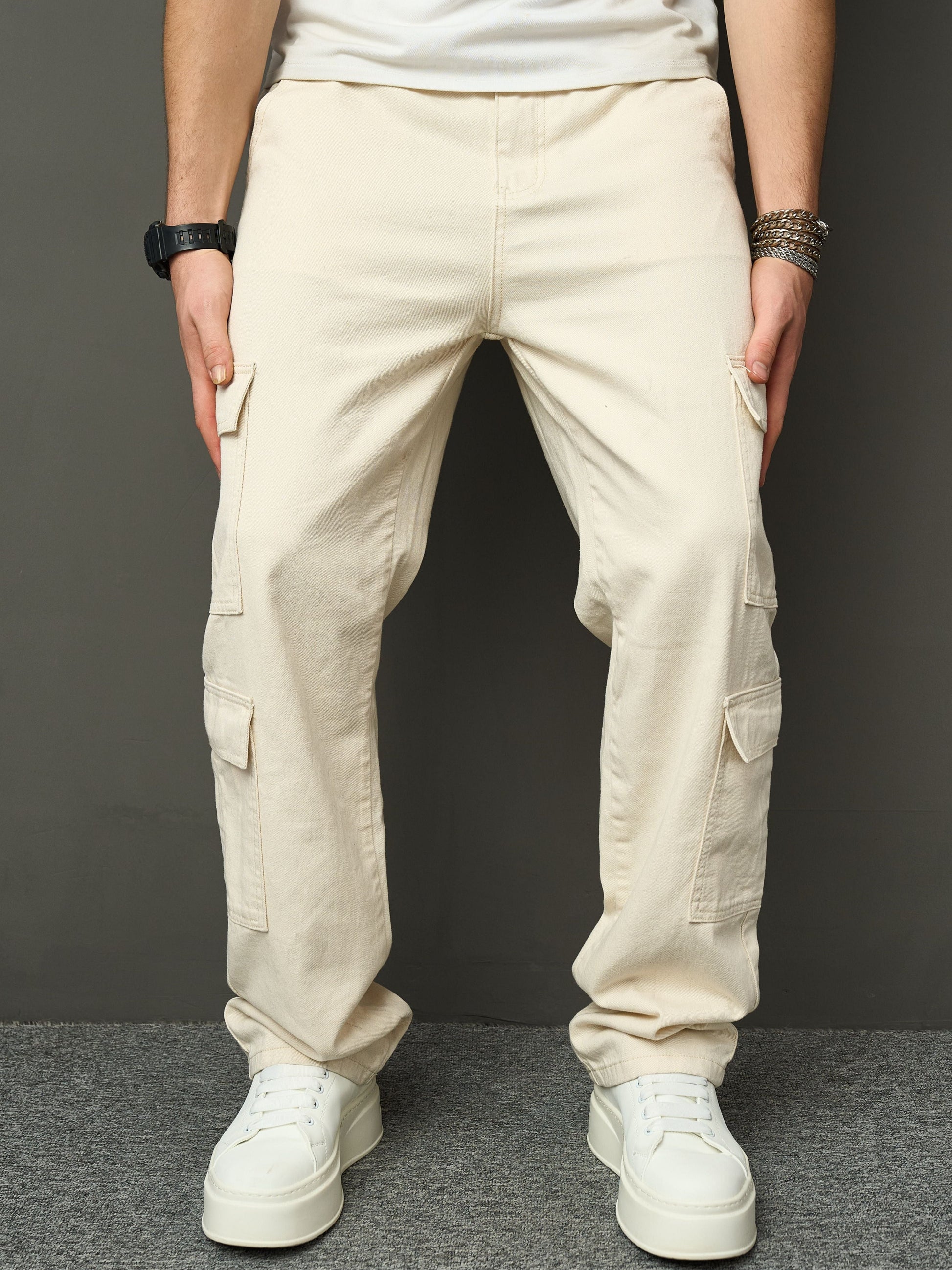 These beige denim jeans with cargo pockets are the perfect choice for anyone who wants to combine comfort, functionality, and style. The loose fit gives you plenty of freedom of movement, while the durable cotton denim provides a rugged look and long-lasting wear.